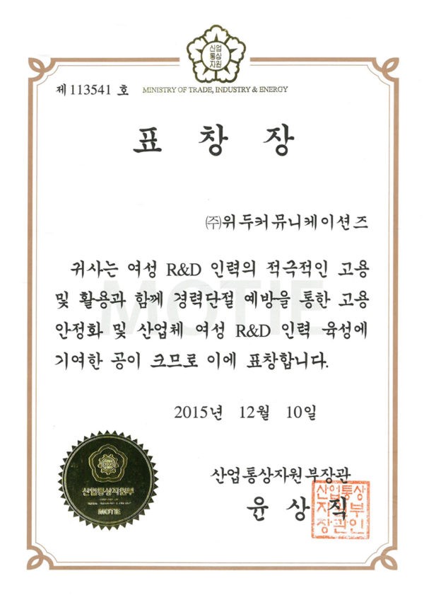 Ministry of Trade, Industry and Energy Award Certificate