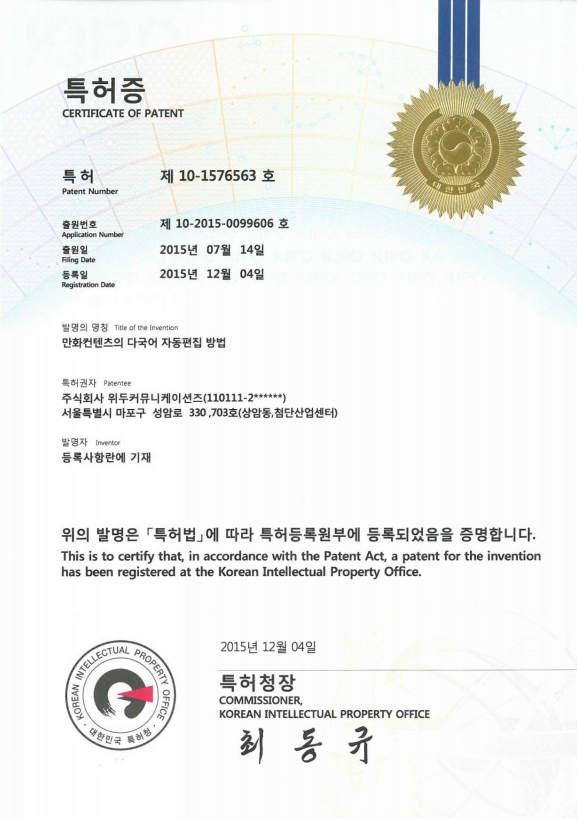 [한국/특허] 만화 컨텐츠의 다국어 자동 편집 방법 페이지 정보 작성자 WeDu 댓글 0건 조회 6,663회 작성일 19-05-30 18:49 본문 2015-07-14 특허 10-2015-0099606 만화 컨텐츠의 다국어 자동 편집 방법 List Previous[한국/특허] 전자서적과 연동되는 게임의 제공 장치 19.05.30