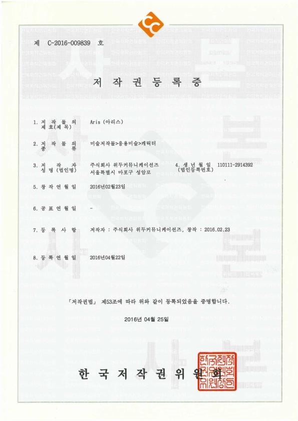 [한국/저작권] 아리스 페이지 정보 작성자 WeDu 댓글 0건 조회 6,553회 작성일 19-05-30 19:09 본문 2016-04-22 저작권 C-2016-009839 아리스 / 미술저작물>응용미술>캐릭터 List Previous[한국/저작권] 필립 19.05.30 Next[한국/저작권] 리안 19.05.30