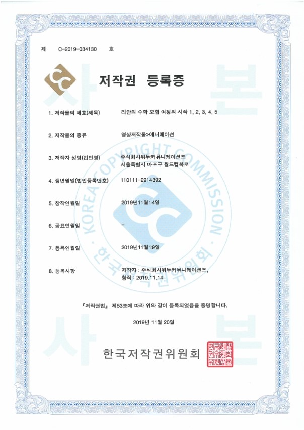 [한국/저작권] 리안의 수학 모험 여정의 시작 1,2,3,4,5 페이지 정보 작성자 WeDu 댓글 0건 조회 6,227회 작성일 21-12-31 12:36 본문 2019-11-20 저작권 C-2019-034130 영상저작물>애니메이션 List Previous[한국/저작권] OLL KIDS/MATH 21.12.31 Next[한국/저작권] 리안의 수학 모험 애니메이션 OST 19.11.25