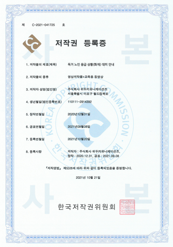 [한국/저작권] 독거 노인 응급 상황(화재) 대피 안내 페이지 정보 작성자 WeDu 댓글 0건 조회 6,757회 작성일 21-12-31 12:41 본문 2021-10-21 저작권 C-2021-041725 영상저작물>교육용 동영상 List Previous[한국/저작권] 장보기 인지훈련 게임 21.12.31 Next[한국/저작권] OLL KIDS/MATH 21.12.31