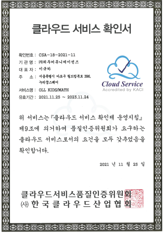 [한국/인증서] OLL KIDS/MATH 클라우드 서비스 확인서 페이지 정보 작성자 WeDu 댓글 0건 조회 10,080회 작성일 21-12-31 12:46 본문 2021-11-25 확인번호 CSA-18-2021-11 서비스명 : OLL KIDS/MATH List Previous[한국/확인서] OLL KIDS/MATH 파스-타 호환성 확인서 21.12.31 Next[한국/저작권] 장보기 인지훈련 게임 21.12.31