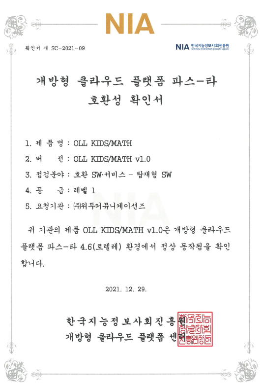 [한국/확인서] OLL KIDS/MATH 파스-타 호환성 확인서 페이지 정보 작성자 WeDu 댓글 0건 조회 10,741회 작성일 21-12-31 12:48 본문 2021-12-29 확인서 제 SC-2021-09 점검분야 : 호환 SW서비스 - 탑재형 SW List Next[한국/인증서] OLL KIDS/MATH 클라우드 서비스 확인서 21.12.31